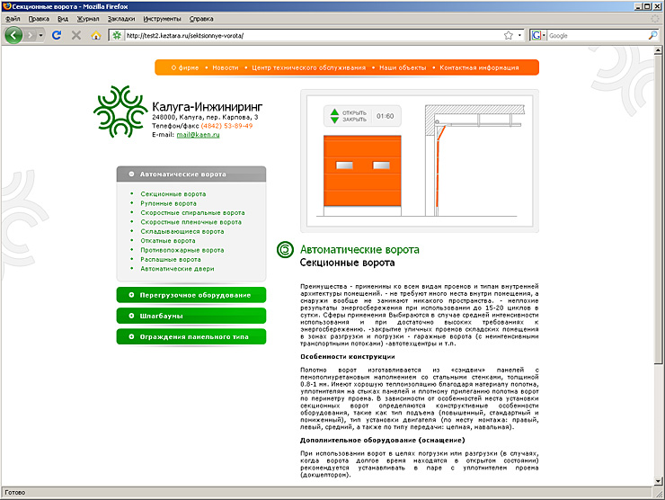 Сайт строительно-монтажной компании «Калуга-Инжиниринг» содержит информацию о компании и специально разработанные анимированные схемы работы автоматических ворот, шлагбаумов и перегрузочного оборудования. http://kaen.ru