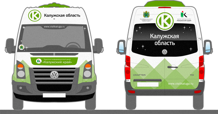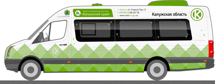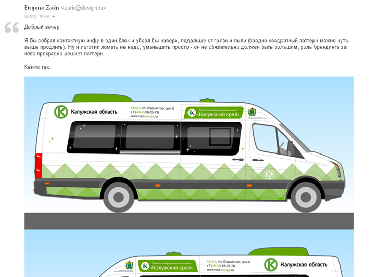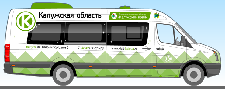 Затем оформление автобуса было согласовано с дизайнером фирменного стиля Калужской области, специалистом студии Артемия Лебедева — Евгением Зориным: