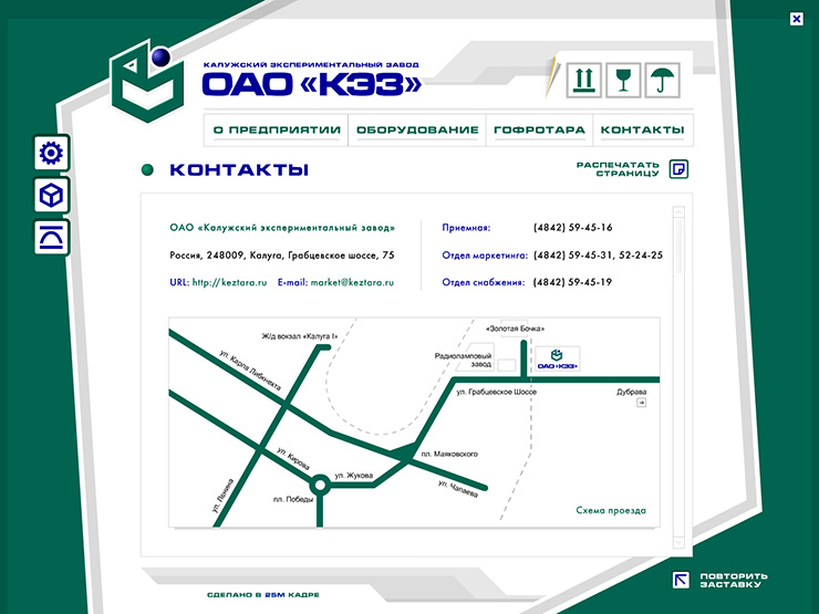 Просмотрев вступительный ролик пользователь понимает, что ему предлагают. Теперь у него есть возможность подробно рассмотреть модельный ряд и основные характеристики оборудования, узнать историю предприятия, адрес, телефон и т.д. Все это есть в небольшой интерактивной части презентации.