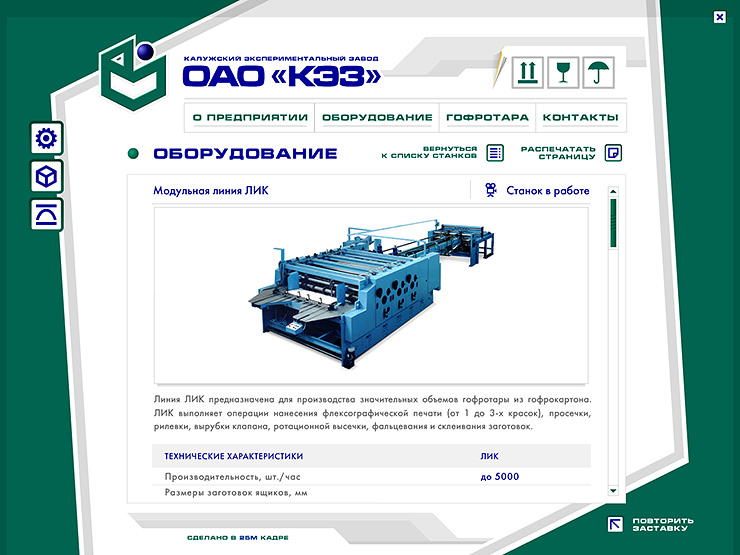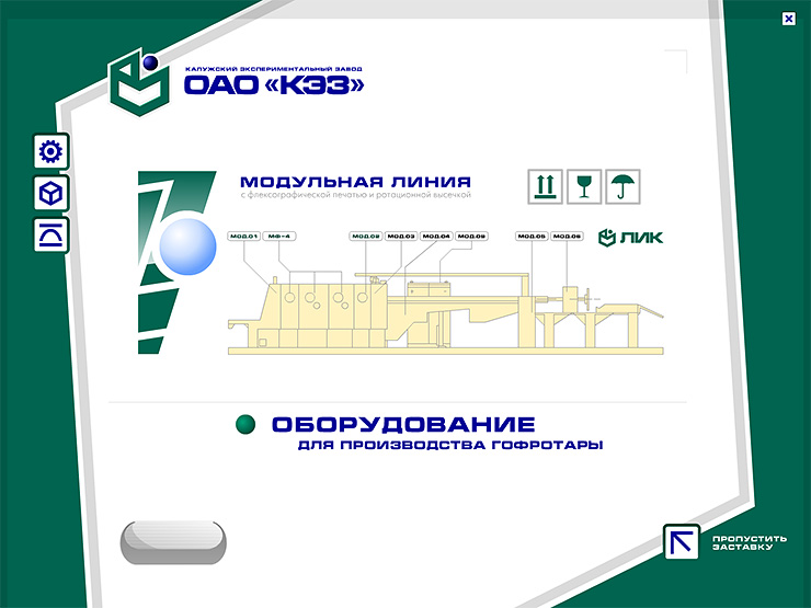 Кроме изготовления самого гофрокартона, модульные линии КЭЗ умеют резать, сгибать и даже печатать на новой упаковке. Обо всем этом пользователь узнает, просматривая презентацию.
