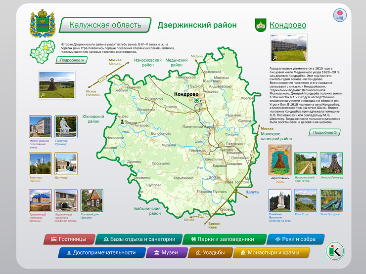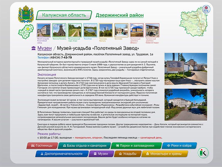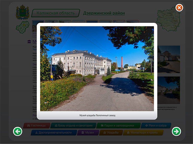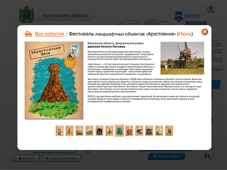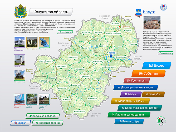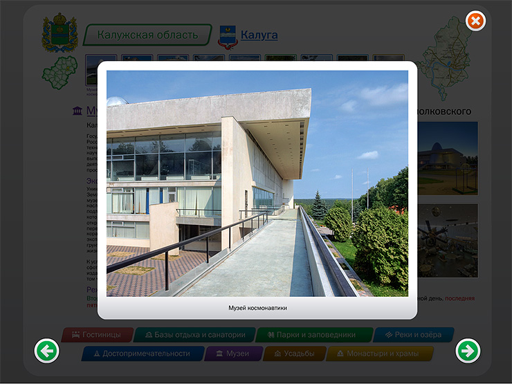 В рамках данного проекта наша студия осуществляла выездную фотосъемку многих достопримечательностей Калуги и области. Сейчас в презентации используется около 3000 фотографий более чем 500 туристских объектов.