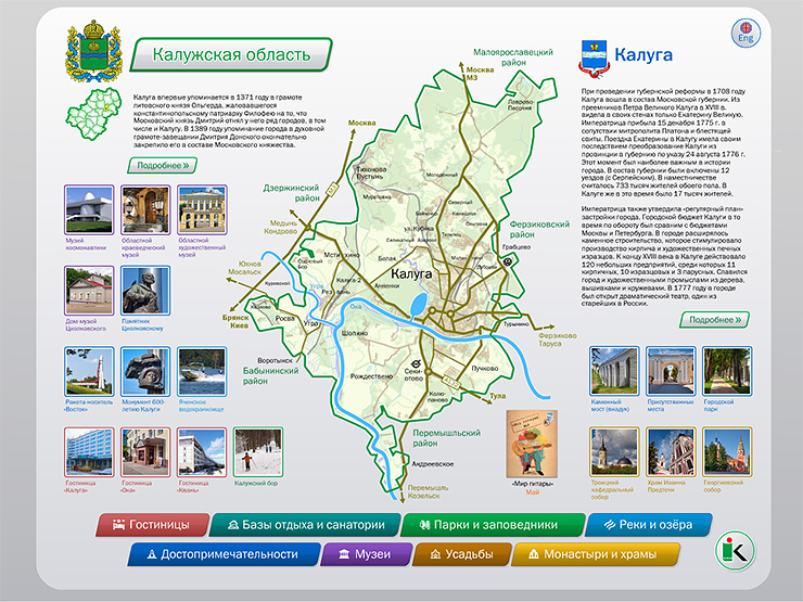 Интерактивная карта была установлена на специальных сенсорных информационных киосках. Такие киоски ТИЦ «Калужский край» разместил в местах, где наиболее часто бывают путешественники.