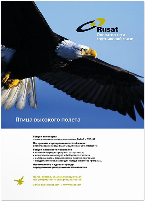Разработка плаката для компании «Русат». Российский оператор сети спутниковой связи «Руcат» (Москва) предоставляет телекоммуникационные услуги на основе собственного телепорта с использованием малогабаритных терминалов для корпоративных заказчиков, операторов связи, государственных предприятий и учреждений. rusat.com